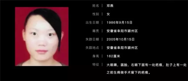 邓燕,女,阜阳市颍州区人,1986年9月15日出生,身高162厘米,大眼睛,圆脸,右眼角下有一处疤痕,肚子上有一条因做手术留下的30厘米长的疤痕。于2005年10月15日因逃学被父亲责打负气出走,至今杳无音讯。
