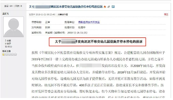 投诉上写着按照《阜城居民小区配套教育设施移交专项治理实施方案》规定;公建配套幼儿园办园场所应于,2018年7月31日一律上交政府,办成公办幼儿园或由原承办人,办成民办普惠性幼儿园并将之前不当租金收归政府或归还承办人。