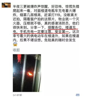 只见73栋楼单元楼道口,火光冲天、烟雾弥漫,火苗蹿到四层楼高!大家一看现场,原来是73号楼的两辆电瓶车在楼道里充电着火爆炸了!