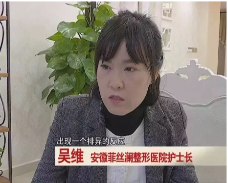 菲丝澜整形医院咨询主任徐靖:“这个就是一个盲区,假体排异做不了“皮试”,不管说几率有多低,可能是1亿个人当中有一个,那如果你碰上了你就是那唯一的一个,我们也不能去做提前的皮试之类的,我们也想做,但是,全国全世界的医院,都做不了这个的“皮试”。”