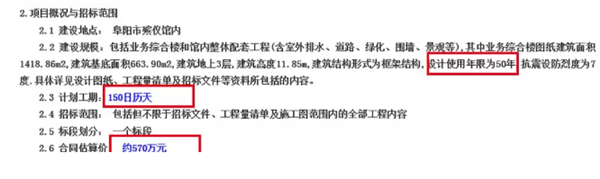 根据公告内容,阜阳市殡仪馆业务综合楼,计划工期5个月,投资约570万,而且全部是财政资金。此外,该栋综合楼的设计使用年限是50年!